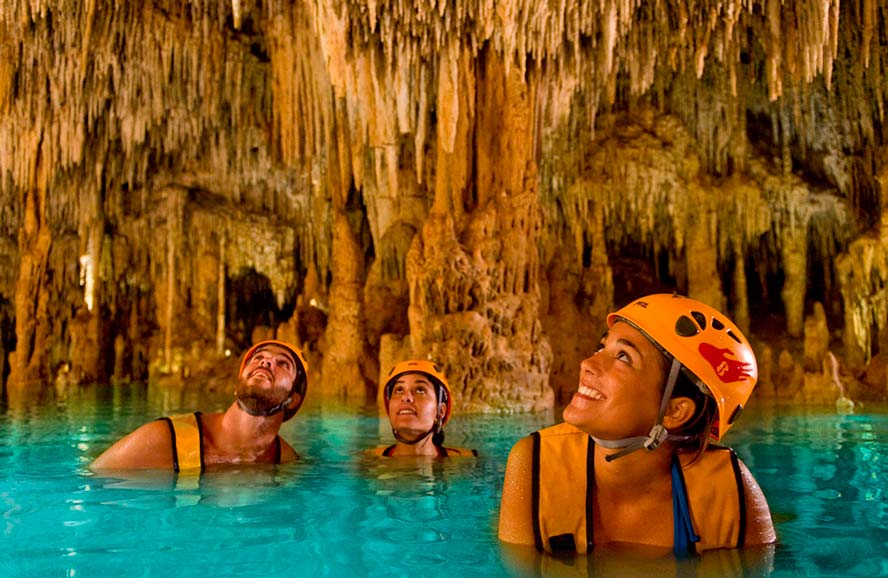 ¿Se te antoja algo más fresco? Sumérgete bajo la superficie y explora antiguos ríos subterráneos en balsa o nadando, serpenteando por cuevas brillantes llenas de espectaculares estalactitas. Es el mundo subterráneo secreto de la naturaleza, y estás invitado.